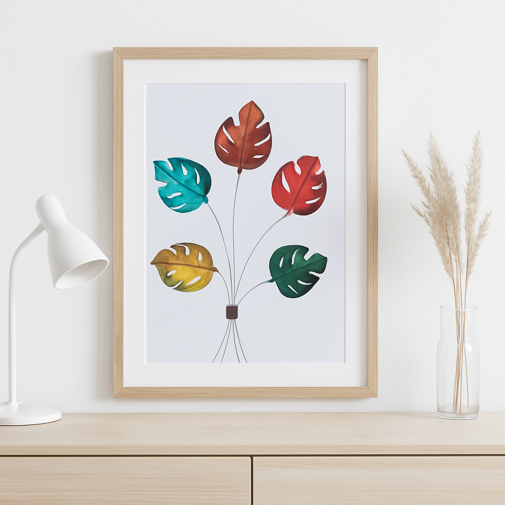 Cinq feuilles de Monstera, chacune peinte d’une teinte unique – bleu éclatant, rouge flamboyant, orange chaleureux, jaune lumineux et vert profond – s’élancent avec grâce.