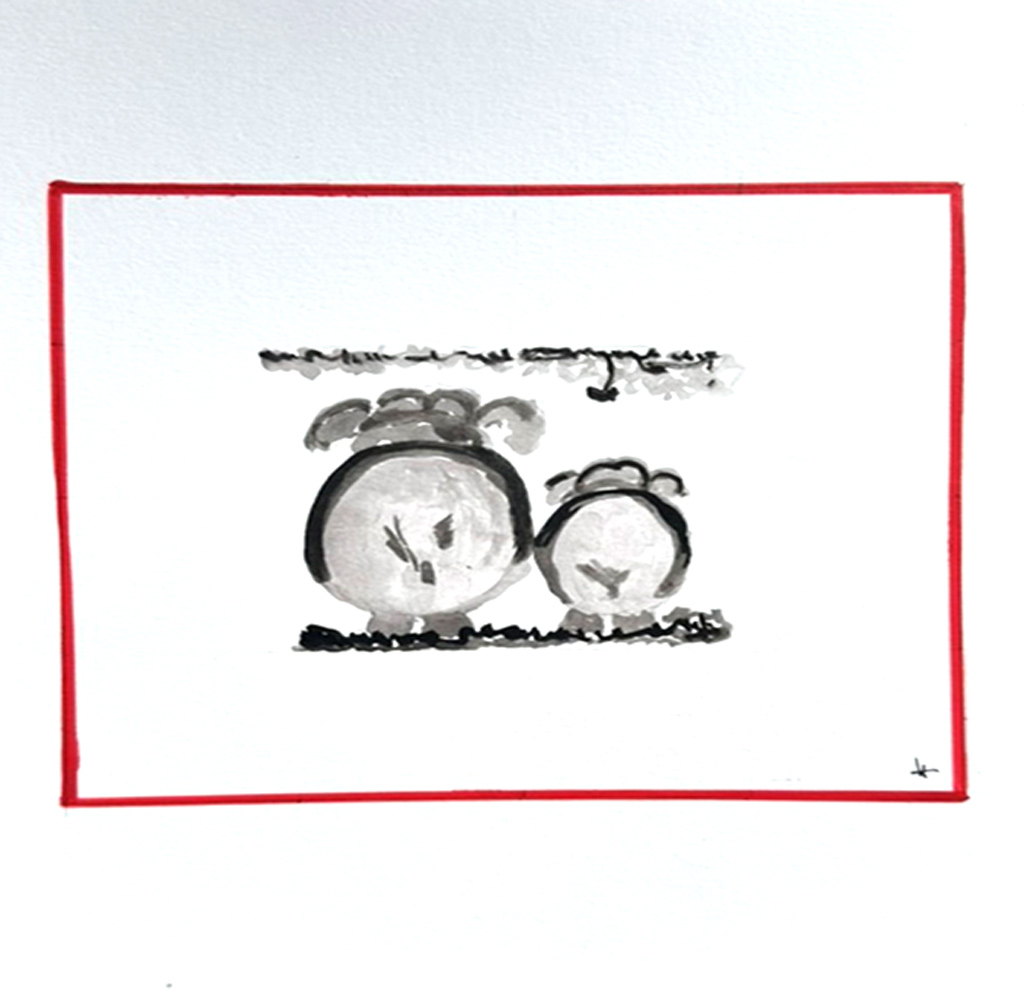Cette illustration en noir et blanc, encadrée d’un fin liseré rouge, met en scène deux éléphants ronds et doux, blottis l’un contre l’autre. Leur pelage est suggéré par quelques coups de pinceau légers, laissant toute la place à l’expression tendre et paisible qui les unit. Un petit dessin, qui, par sa sobriété, attire l’oeil et rechauffe le coeur.