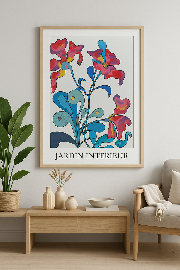 Une œuvre florale abstraite aux couleurs vibrantes, mêlant formes organiques et harmonie visuelle pour inviter à la contemplation et à la sérénité.