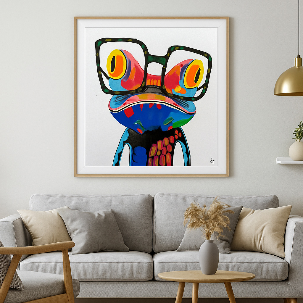 Avec son regard curieux derrière ses lunettes oversize, cette grenouille haute en couleurs incarne l’originalité et la bonne humeur. Ce mélange audacieux de teintes vives et de formes géométriques crée un style pop-art unique, à la fois fun et décalé.