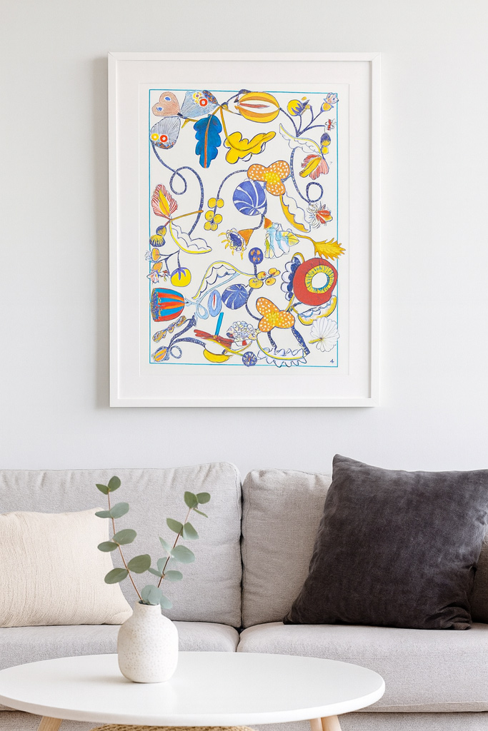 Une explosion de formes et de couleurs pour un jardin imaginaire peuplé de fleurs inventées, de fruits fantaisie et de papillons curieux.