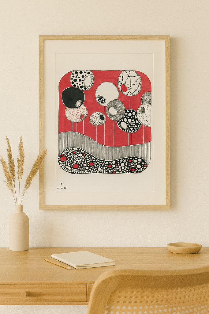 Le contraste entre noir, blanc et rouge crée un rythme graphique fort, où chaque forme semble raconter sa propre histoire : Une composition énigmatique et poétique.