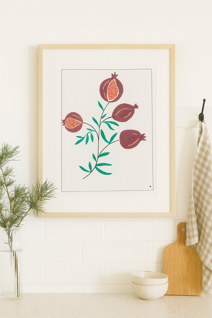 Entre poésie botanique et minimalisme joyeux, ce rameau de grenades évoque la générosité de la nature avec douceur. Une création à la fois décorative et pleine de vitalité.