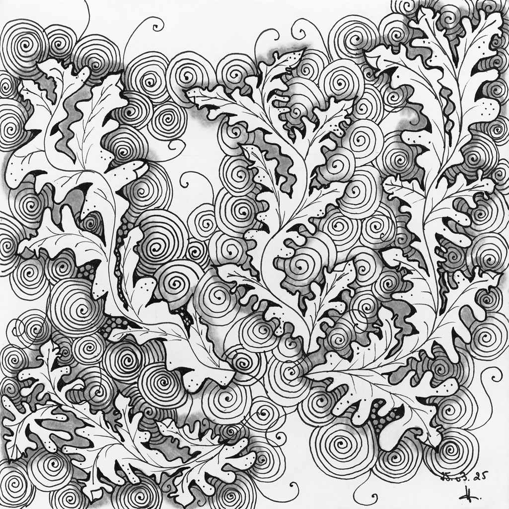 Feuilles nerveuses et spirales envoûtantes s’entrelacent dans une danse graphique minutieuse, presque hypnotique.